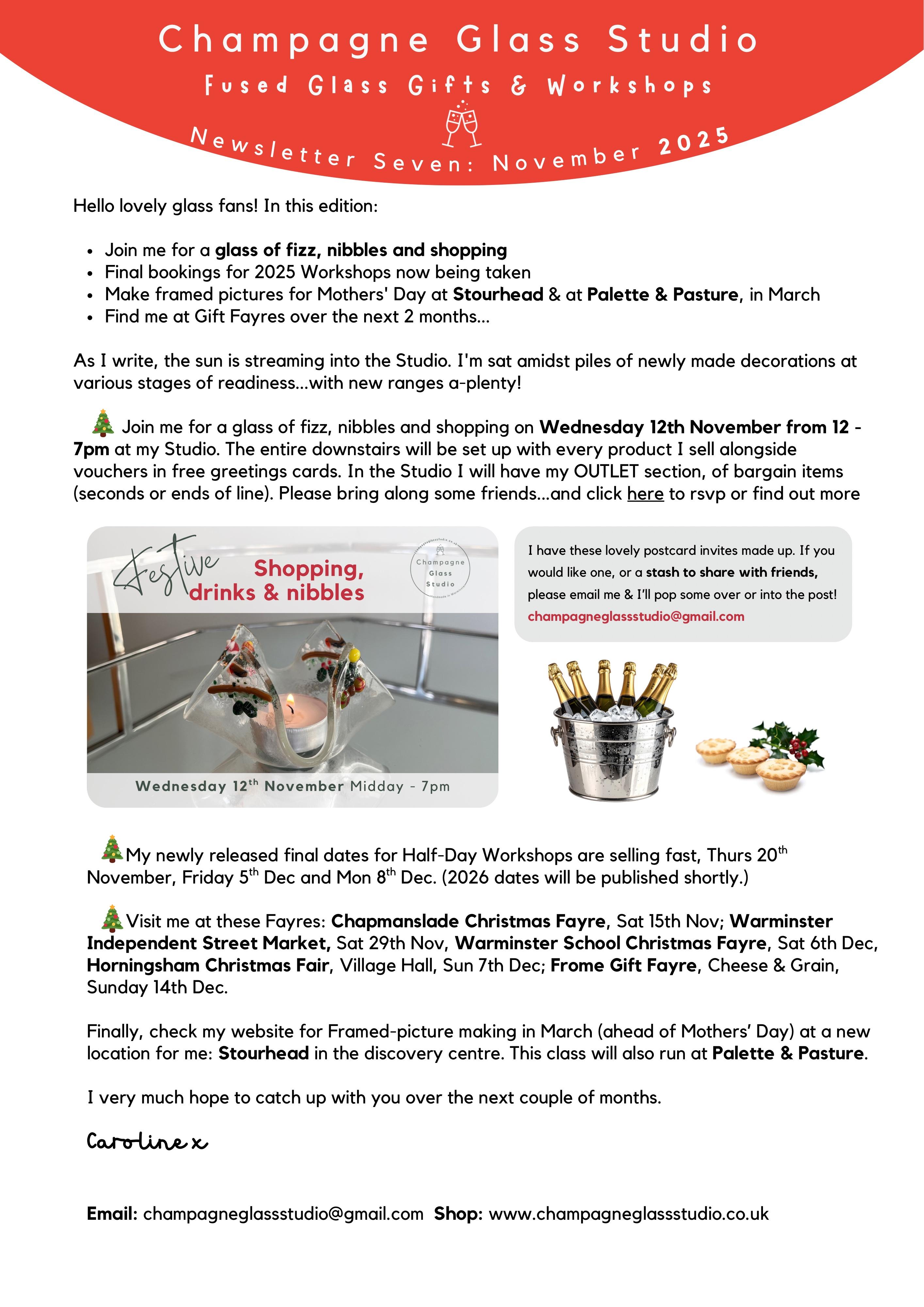 Advanced Fusers Half-Day Class *NEW* 🌻For everyone who has attended AT LEAST ONE OF MY WORKSHOPS I have a new Half-Day class coming for 2025 at my Warminster Studio. Less chat from me...making a variety of items including drinks coasters and jewellery dishes. Cutting glass or just using murrini 🌷it's up to you 🎁 Workshop vouchers will be valid on these classes...dates will be released in January with the first classes coming your way from March onwards.